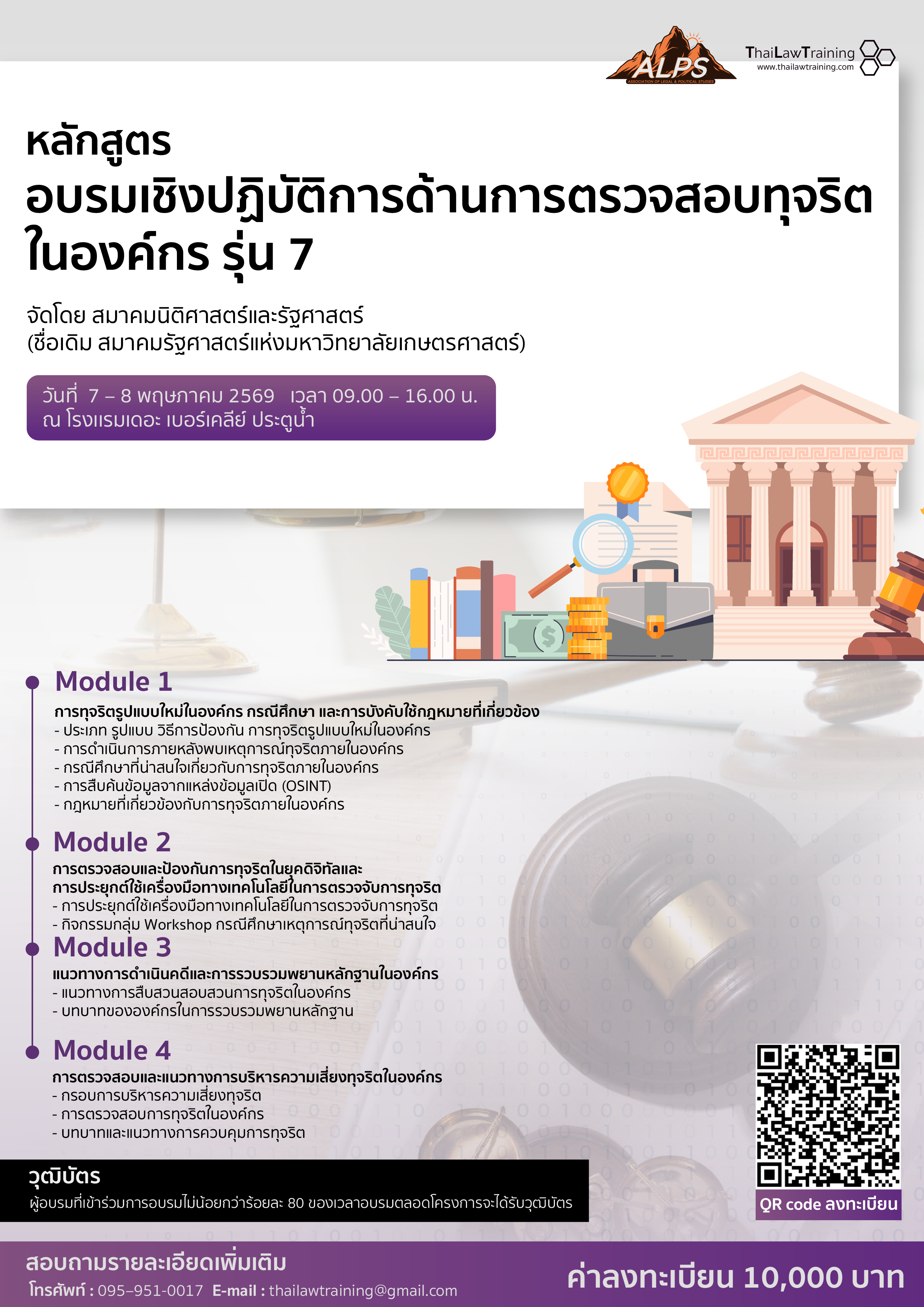 กำหนดการอบรมในวันที่ 7 – 8 พฤษภาคม 2569 เวลา 09.00 – 16.00 เวลา 09.00 – 16.00 น. รวม 2 วัน