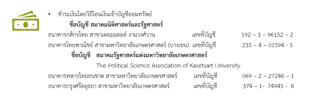 - 4. เพื่อส่งเสริมกิจกรรมทางวิชาการของสมาคมนิติศาสตร์และรัฐศาสตร์ (ชื่อเดิม สมาคมรัฐศาสตร์แห่งมหาวิทยาลัยเกษตรศาสตร์) เพื่อให้เกิดประโยชน์ต่อสังคมส่วนรวมและประเทศ