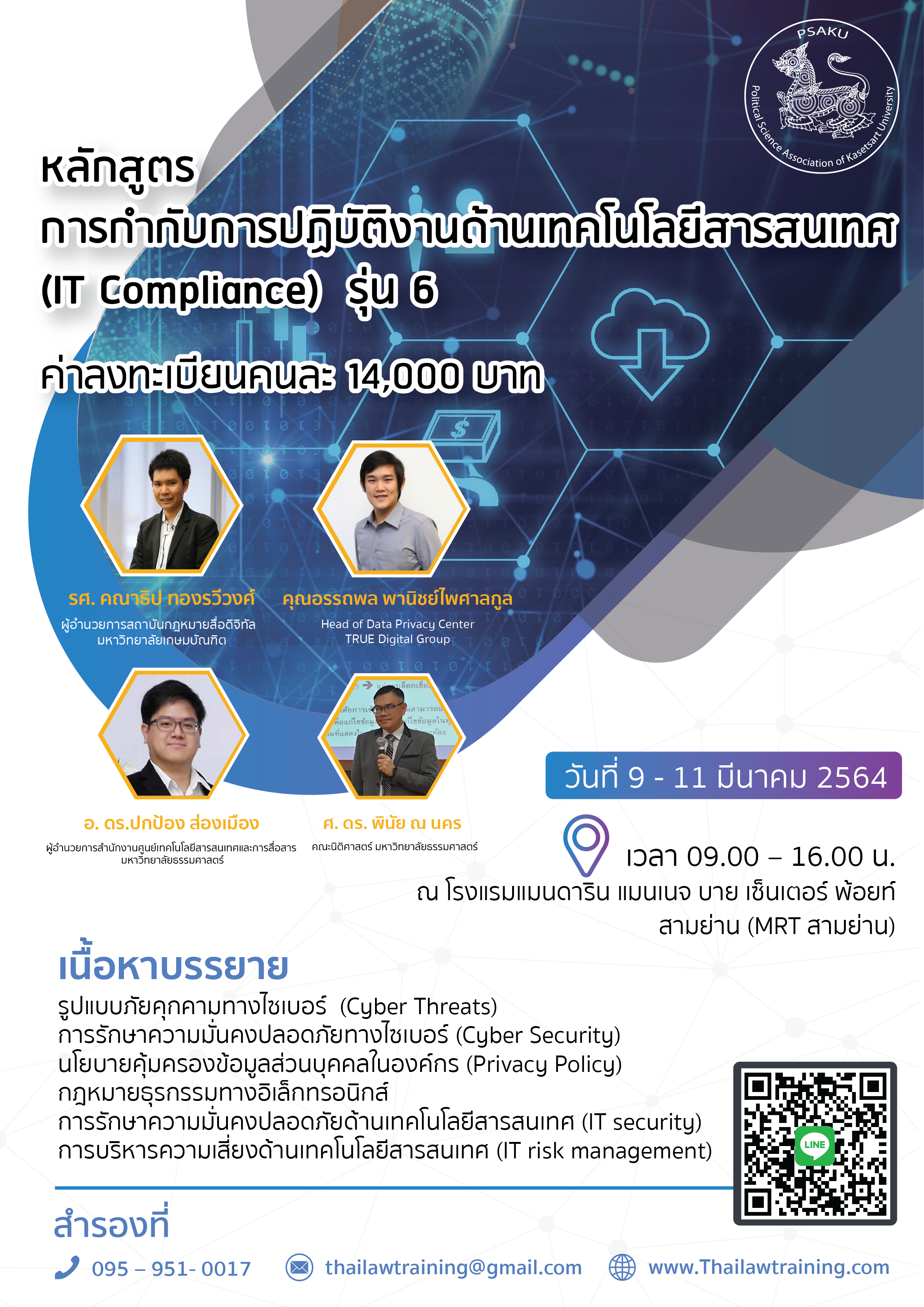 สมาคมรัฐศาสตร์แห่งมหาวิทยาลัยเกษตรศาสตร์ ซึ่งมีวัตถุประสงค์ในการส่งเสริมความรู้ทางวิชาการและการอบรม ได้ตระหนักถึงความจำเป็นดังกล่าว จึงกำหนดจัดอบรมหลักสูตรการกำกับการปฏิบัติงานด้านเทคโนโลยีสารสนเทศ (IT Compliance) รุ่น 6 วันที่ 9 – 11 มีนาคม 2564 เวลา 09.00 – 16.00 น. รวม 3 วัน ณ ห้องบุษบา ชั้น 1 โรงแรมแมนดาริน แมนเนจ บาย เซ็นเตอร์ พ้อยท์ (MRT สามย่าน) กลุ่มเป้าหมายผู้อบรมคือ ผู้บริหารและผู้รับผิดชอบด้านเทคโนโลยีสารสนเทศ ผู้ปฏิบัติงานด้านเทคโนโลยีสารสนเทศ ผู้ตรวจสอบด้าน IT ผู้ปฏิบัติงานในองค์กรธุรกิจในส่วนที่เกี่ยวข้อง ที่ปรึกษาและผู้สนใจทั่วไป