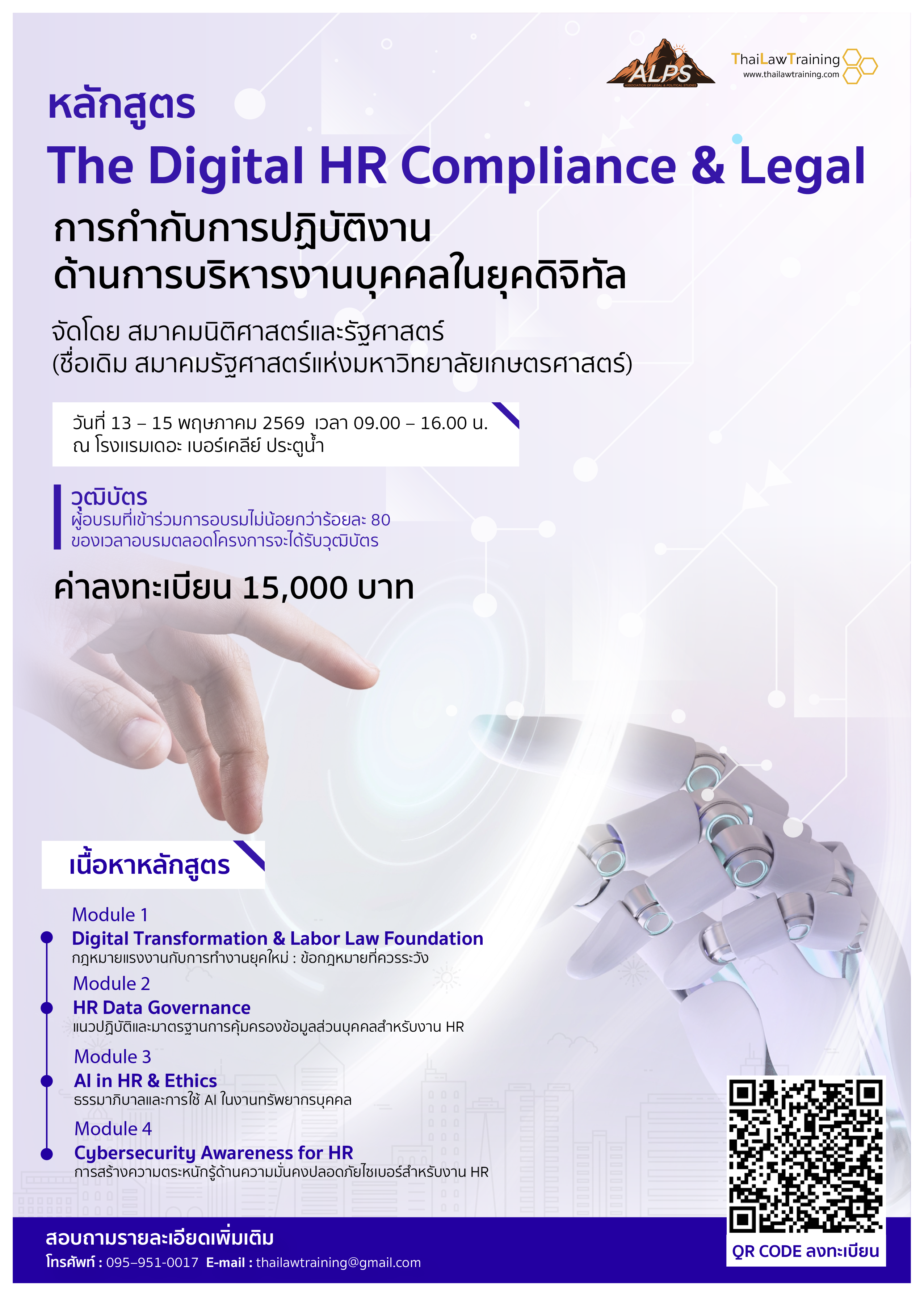 กำหนดการอบรมในวันที่ 13 – 15 พฤษภาคม 2569 เวลา 09.00 – 16.00 เวลา 09.00 – 16.00 น. รวม 3 วัน