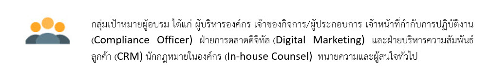 หลักสูตรการกำกับการปฏิบัติงานสำหรับธุรกิจดิจิทัล (Digital Business Compliance) รุ่นที่ 7 มุ่งเน้นการสร้างความรู้ความเข้าใจด้านกฎหมายที่เกี่ยวข้องกับการประกอบธุรกิจในยุคดิจิทัล เนื้อหามีดังนี้